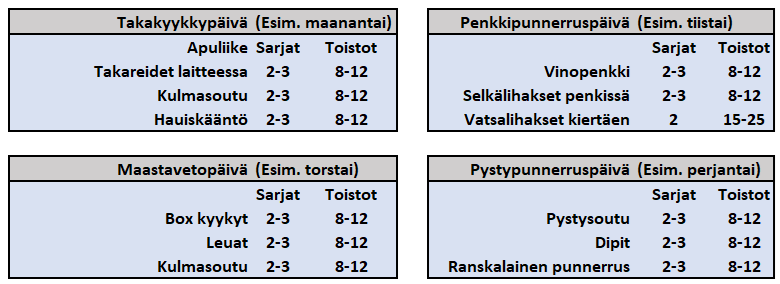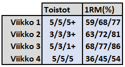 Ohjelma perustuu pääliikkeissä seuraaviin prosentteihin yhden toiston maksimistasi: