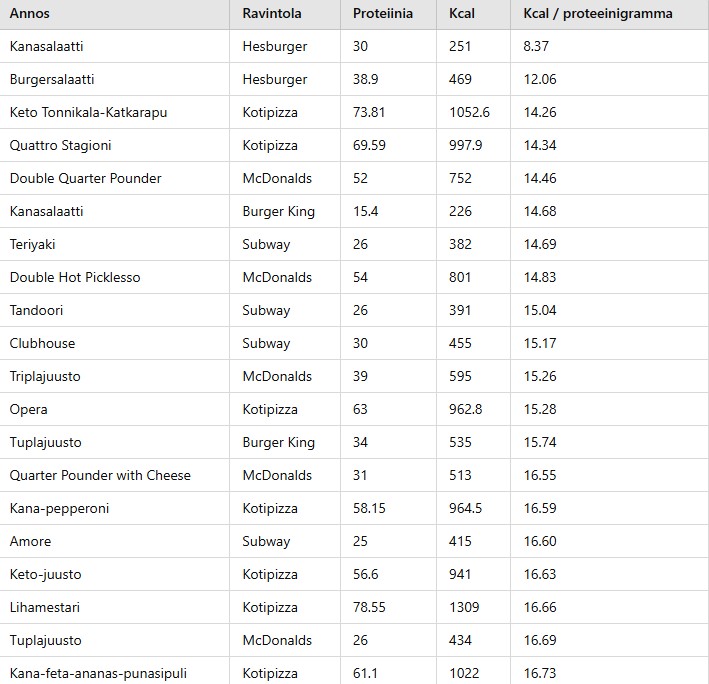 Alla oleva taulukko esittää top 20 pikaruokaa, joissa on eniten proteiinia viidestä suurimmasta suomessa tarjolla olevasta pikaruokalasta. Taulukko on järjestetty sen mukaan, kuinka paljon (vähän) kilokaloreita kussakin ruuassa on proteiinigrammaa kohden. Tavoitteena on osoittaa mitkä ruuat ovat parhaita lihasten rakentamiseen samalla kun ei haluta liikaa kaloreita.