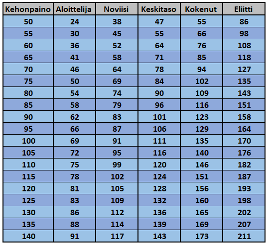 Strenght Log -sovelluksen 17 296 mieskäyttäjän tietoihin perustuen tilasto siitä, mihin kategoriaan nostaja sijoittuu milläkin penkkipunnerrustuloksella (kg), milläkin kehonpainolla (kg).