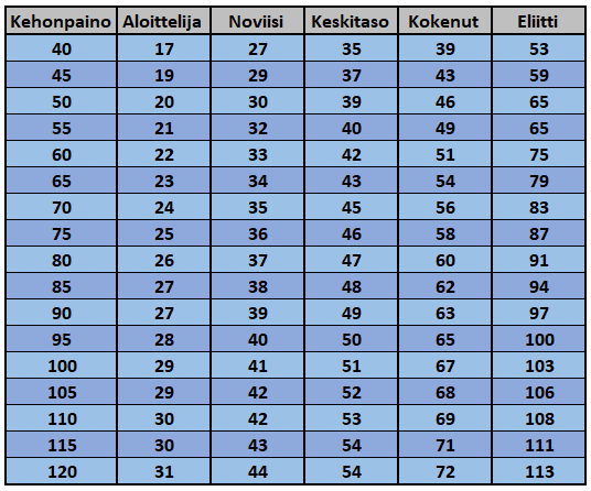 Strenght Log -sovelluksen 7 112 naiskäyttäjän tietoihin perustuen tilasto siitä, mihin kategoriaan nostaja sijoittuu milläkin penkkipunnerrustuloksella (kg), milläkin kehonpainolla (kg).