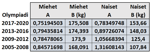 Sinclairin kerroin jokaiselle urheilijalle lasketaan seuraavalla kaavalla: