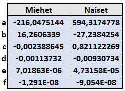 missä ”x” on nostajan kehon paino kilogrammoissa ja missä ”a”, ”b”, ”c”, ”d”, ”e” ja ”f” ovat: