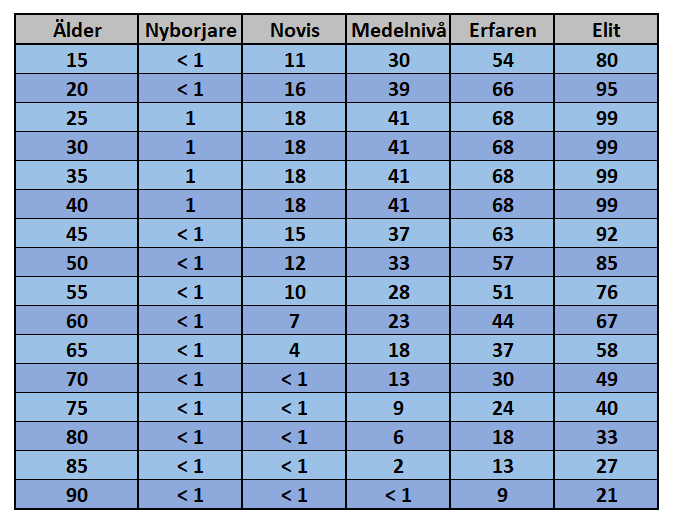 *Statistik från Strength Level-användare som visar vilken kategori en man hamnar i baserat på antalet armhävningar och ålder.*