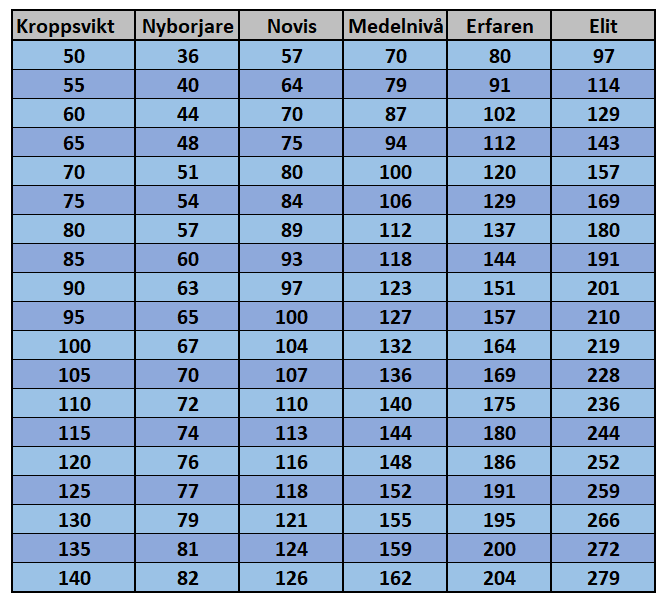 Längre ner i artikeln hittar du även en vägledning om vad som är ett bra resultat i förhållande till lyftarens egen vikt. Du kanske också är intresserad av vår artikel om bänkpress kalkylator och Bra Chinsresultat