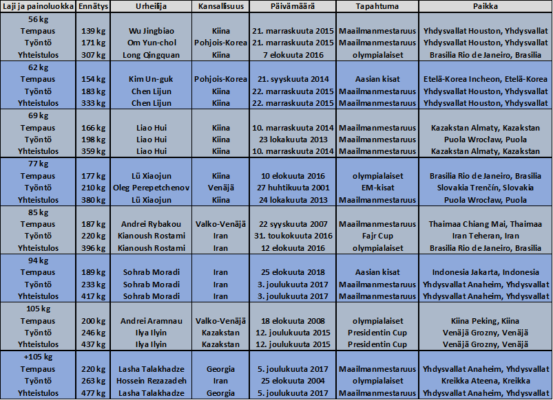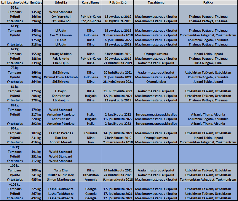 Alle on kerätty painoluokkien maailmanennätykset 1.6.2025 asti.