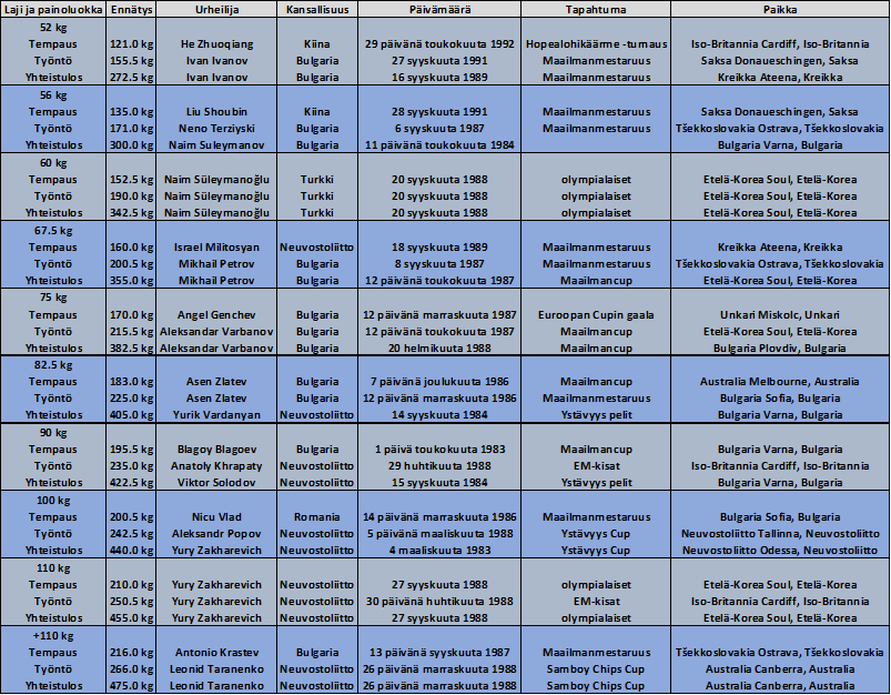 Painonnoston miesten maailmanennätyksiä vuosien 1973-1992 mukaisissa painoluokissa jäi haltuun vain Kiinalle, Bulgarialle, Turkille, Neuvostoliitolle ja Romanialle.