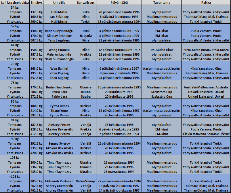 Painonnoston miesten maailmanennätyksiä vuosien 1993-1997 mukaisissa painoluokissa jäi haltuun Turkille, Kiinalle, Bulgarialle, Kreikalle, Ukrainalle, Kuuballe, Venäjälle ja Valko-Venäjälle.