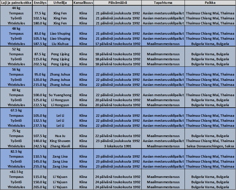 Painonnoston naisten maailmanennätyksiä vuosien 1988-1992 mukaisissa painoluokissa dominoi täydellisesti Kiina. Jokaisen painoluokan maailmanennätys on kiinalaisen nostajan nimissä.