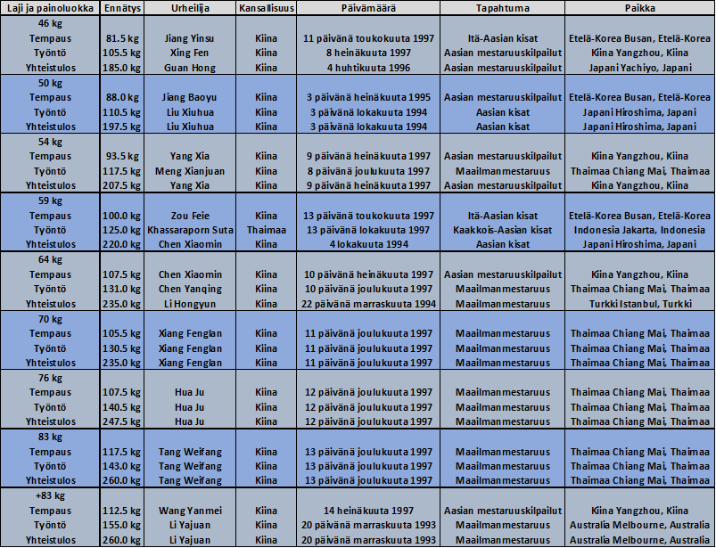 Painonnoston naisten maailmanennätyksiä vuosien 1993-1997 mukaisissa painoluokissa jäi haltuun vain Kiinalle ja Thaimaalle. 26 ennätyksistä jäi Kiinalle ja 1 Thaimaalle.