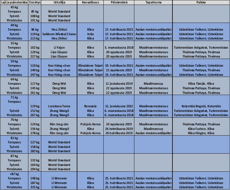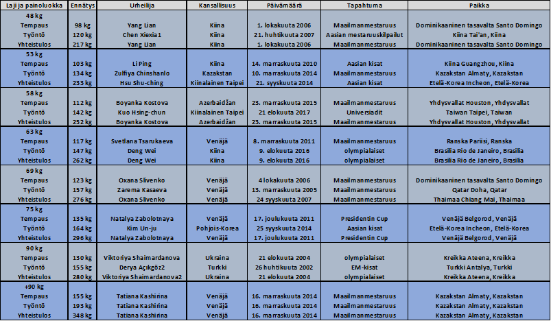 Naisten kaikkien aikojen maailmaennätys on tempauksessa 155 kg, työnnössä 193 kg ja yhteistuloksessa 348 kg. Kaikki kolme ennätystä ovat venäläisen Tatiana Kashirinan nimissä ja nekin tehtiin keskenään samana päivänä, vuoden 2014 maailmanmestaruuskilpailuissa.