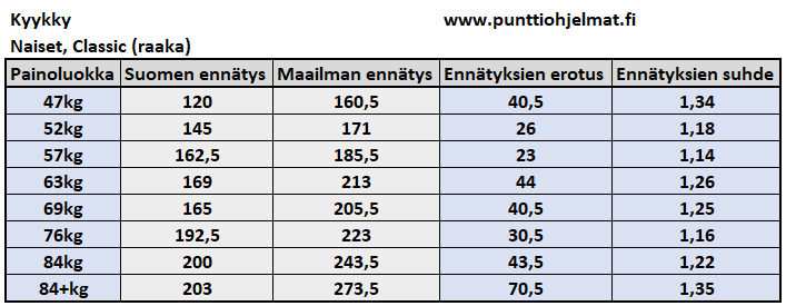 Kyykyn suomenennätyksien ja maailmanennätyksien ero painoluokittain vaihtelee välillä 23-70,5 kg, joka tarkoittaa 1,14-1,35 kertaista eroa ennätyksissä. Keskiarvollisesti ero on 39,8 kg ja 1,24-kertainen.