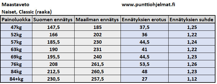 Maastavedon suomenennätyksien ja maailmanennätyksien ero painoluokittain vaihtelee välillä 27-53,5 kg, joka tarkoittaa 1,12-1,26 kertaista eroa ennätyksissä. Keskiarvollisesti ero on 41,5 kg ja 1,22-kertainen.