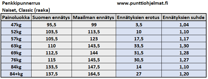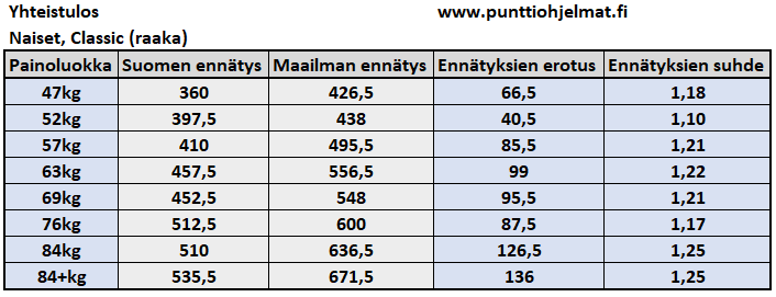 Yhteistuloksen suomenennätyksien ja maailmanennätyksien ero painoluokittain vaihtelee välillä 40,5-136 kg, joka tarkoittaa 1,1-1,25 kertaista eroa ennätyksissä. Keskiarvollisesti ero on 92,1 kg ja 1,2-kertainen.